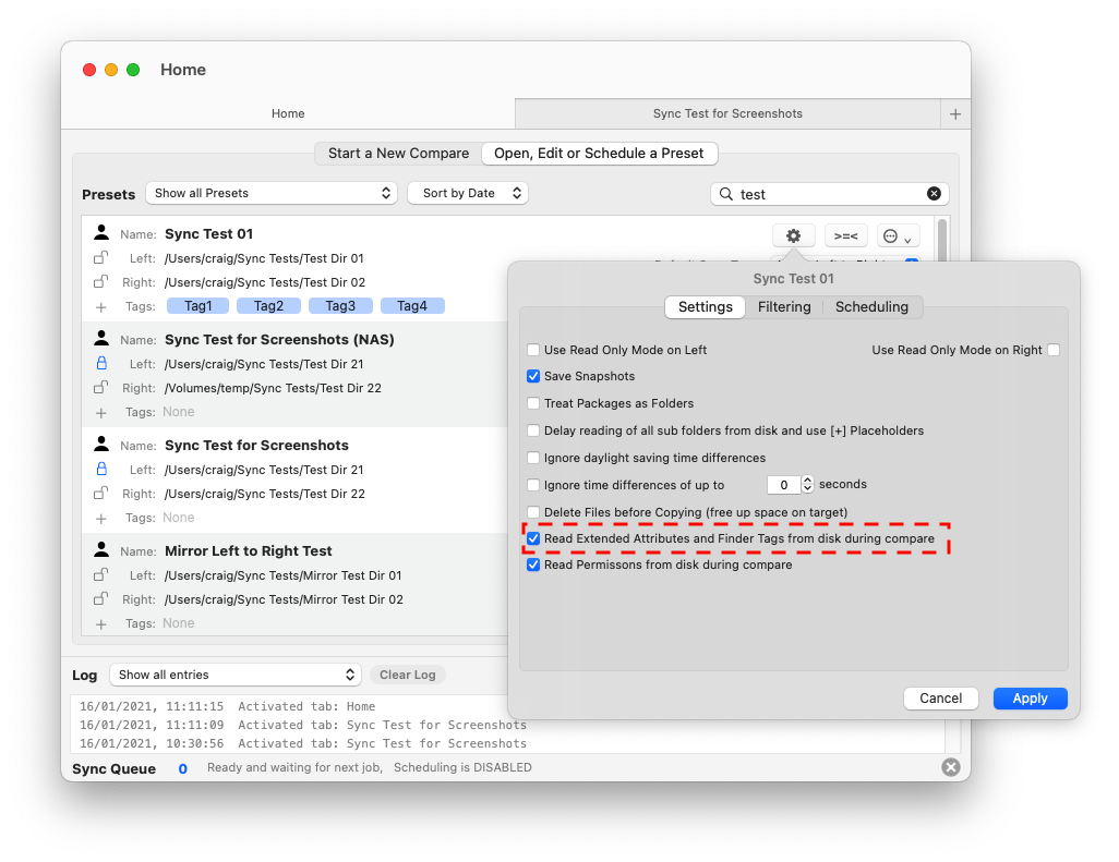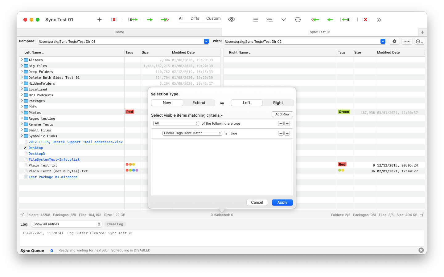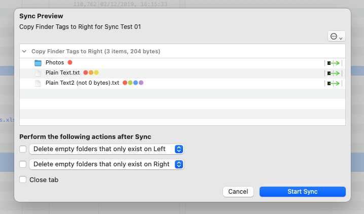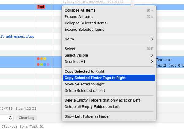 Initial support for Finder Tags was added to Folder Sync 2 version 2.15.0 and this how-to describes how to enable the display of the Finder Tags within the UI, how to use them to select items and also how to copy only the tags from one side to the other.