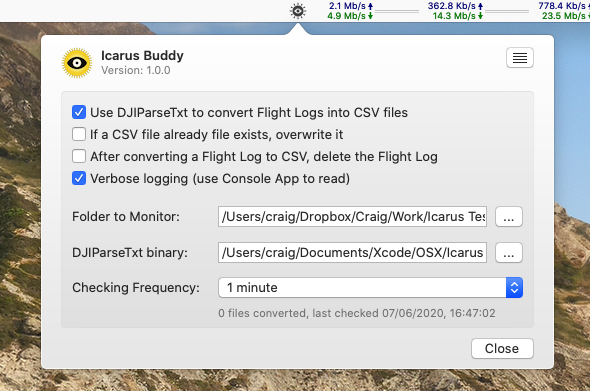 Both of these utilities are excellent. DJiParseTxt is distributed as open source and is very simple to download and compile using a single make command. Once compiled, .txt files can be converted to .csv files using a single command line but to make things even simpler, we also provide a helper application called Icarus Buddy which can be configured to monitor a specific folder and to automatically convert all Flight Logs you add into that folder to .csv files for you.